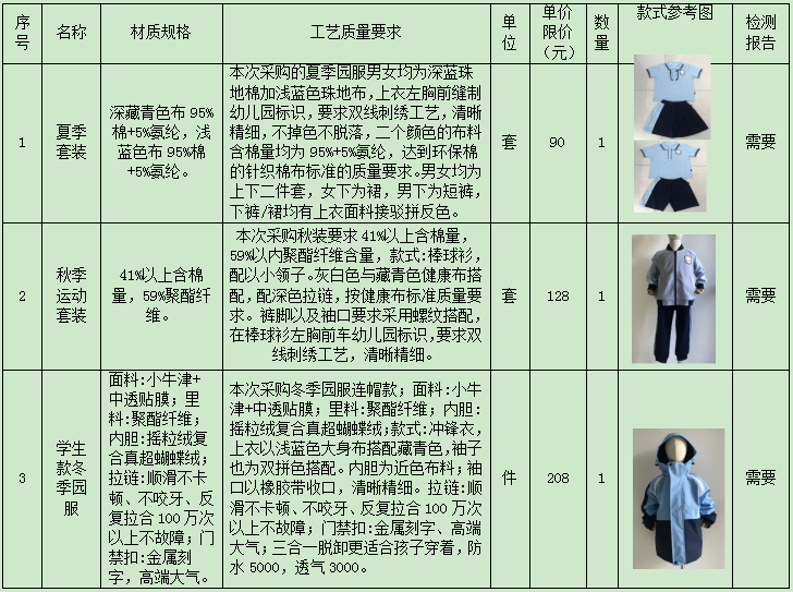 5.項(xiàng)目概況:本項(xiàng)目為常州市新北區(qū)新橋街道中心幼兒園園服采購項(xiàng)目,包括園服制作、運(yùn)抵、卸貨至采購人現(xiàn)場指定位置,通過采購人及其他相關(guān)部門的驗(yàn)收,直至發(fā)放和余貨取回等全過程工作。其中每套園服包含:夏季套裝1套,秋季運(yùn)動(dòng)套裝1套、冬季園服1件。成交單位需等到采購人新生報(bào)到,征得2/3以上家長同意后,雙方才履行合同,采購人負(fù)責(zé)將采購款式、數(shù)量交予成交單位,成交單位按照采購人提供的款式、顏色要求制造校服,校服面料必須與采購需求中一致。貧困學(xué)生校服征訂工作按教育主管部門相關(guān)文件執(zhí)行。成交單位還需要承擔(dān)其他班級園服的增訂工作,具體數(shù)量價(jià)格按照現(xiàn)有標(biāo)準(zhǔn)實(shí)行。