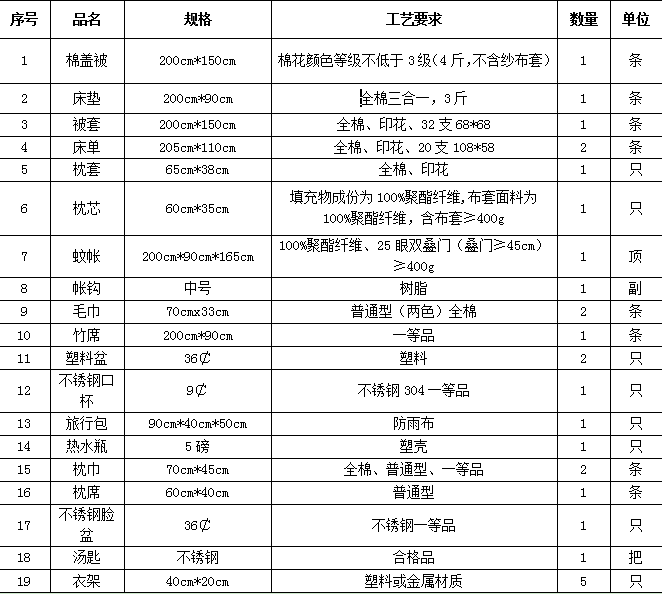 名稱(chēng):棉蓋被、床墊、被套、床單、枕套、枕芯、蚊帳、帳鉤、毛巾、竹席、塑料盆、不銹鋼口杯、旅行包、熱水瓶、枕巾、枕席、不銹鋼臉盆、湯匙、衣架。 品牌:定制 規格型號、款式:詳見(jiàn)附件清單明細 數量:詳見(jiàn)附件清單明細 價(jià)格:人民幣陸佰叁拾捌元整每套(¥638元/套) 服務(wù)年限:兩年,合同一年一簽,通過(guò)采購人綜合考核滿(mǎn)意后可續簽下一年合同。 檢測標準:床上用品達到GB18401《國家紡織產(chǎn)品基本安全技術(shù)規范》、GB/T 29862-2013《紡織品纖維含量的標識》、GB 31701-2015《嬰幼兒及兒童紡織產(chǎn)品安全技術(shù)規范》和DB 32/T 525-2010《學(xué)生公寓用紡織品》等國家標準、規范的要求,符合項目所在地政府有關(guān)特殊要求,同時(shí)滿(mǎn)足采購人使用要求,保證能通過(guò)采購人的質(zhì)量驗收、竣工驗收等各類(lèi)驗收。 檢測項目:游離甲醛、苯、甲苯、二甲苯等 售后服務(wù):1)嚴格按照國家“三包”政策供貨,在投入使用后二年內,進(jìn)行售后跟蹤,提供7*24小時(shí)售后服務(wù),出現質(zhì)量問(wèn)題,將在24小時(shí)內解決或提供解決方案。 2)中標單位需準備一定量的庫存,如采購人臨時(shí)需要增加的,須在最短時(shí)間內及時(shí)供貨。 |