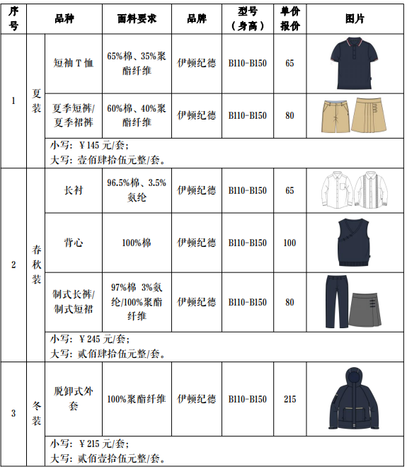 名稱(chēng):見(jiàn)附件分項明細報價(jià)表。 品牌:見(jiàn)附件分項明細報價(jià)表 規格型號、款式:見(jiàn)附件分項明細報價(jià)表 數量:見(jiàn)附件分項明細報價(jià)表,按實(shí)結算 價(jià)格:¥595元/套 服務(wù)年限:兩年,合同一年一簽,經(jīng)采購人考核滿(mǎn)意后,方可續簽下一年合同。 質(zhì)量標準:GB 31701-2015《嬰幼兒及兒童紡織產(chǎn)品安全技術(shù)規范》或GB 18401-2010《國家紡織產(chǎn)品基本安全技術(shù)規范》、GB/T 31888-2015《中小學(xué)生校服》等。生產(chǎn)過(guò)程中,如果有相關(guān)新標準出臺,則釆用新標準。沒(méi)有提及的標準參照國家和地方相關(guān)最新標準。 檢測項目:校服的供應和驗收應實(shí)行“雙送檢”制度,在成交單位送檢的基礎上,采購人隨機抽取一定數量校服送法定檢驗機構檢驗,應按照“雙隨機、一公開(kāi)”的要求組織抽檢。 成交單位在確定給采購人進(jìn)行批量生產(chǎn)前,必須給采購人提供由常州纖維檢驗所出具的相關(guān)成衣合格檢測報告。 在校服發(fā)放給學(xué)生之前,由采購人抽樣送常州纖維檢驗所進(jìn)行二次檢驗,采購人在得到常州纖維檢驗所出具的抽檢合格檢測報告后,方能將校服發(fā)放給學(xué)生,二次送檢費用由采購人負責。 如抽檢不合格的,抽檢費用由成交單位承擔,采購人有權立即終止合同不予支付貨款,如因此造成的交貨延誤,給采購人造成不良影響或者損失的,采購人有權追究其違約責任。 售后服務(wù):校服發(fā)放后,學(xué)生穿著(zhù)明顯不合身或影響學(xué)生正常使用,在較短時(shí)間內發(fā)生質(zhì)量問(wèn)題的,中標單位必須按照學(xué)生、家長(cháng)的要求在3天內進(jìn)行無(wú)條件的退換或量身定制。一年中拉鏈出現質(zhì)量問(wèn)題,由供貨商負責免費維修或調換。響應時(shí)間為 24 小時(shí)。為保證更好的提供全校學(xué)生校服的售后服務(wù),校服零售價(jià)應和中標價(jià)保持一致。 及時(shí)安排服務(wù)人員解決家長(cháng)提出的有關(guān)問(wèn)題新生校服尺碼的測量采用網(wǎng)上申報和現場(chǎng)復核的方式;為便于家長(cháng)采購校服,需要開(kāi)通線(xiàn)上采購的渠道。為便于校服的調換,中標單位應在采購單位存放適量不同規格的校服。請在投標文件中提供售后服務(wù)點(diǎn)的服務(wù)要求、新生校服尺碼詳細的測量方式、區分不同年級校服的方式、線(xiàn)上采購的渠道及方便學(xué)生校服更換的措施。 質(zhì)保期:免費質(zhì)保期3年,自物品驗收合格之日起(采購人代表在驗收報告上簽字之日起計算)至少12個(gè)月內正常使用。 嚴格按照國家“三包”政策供貨,在投入使用后至少三年內,進(jìn)行售后跟蹤,提供7*24小時(shí)售后服務(wù),出現質(zhì)量問(wèn)題,將在24小時(shí)內解決或提供解決方案。 |